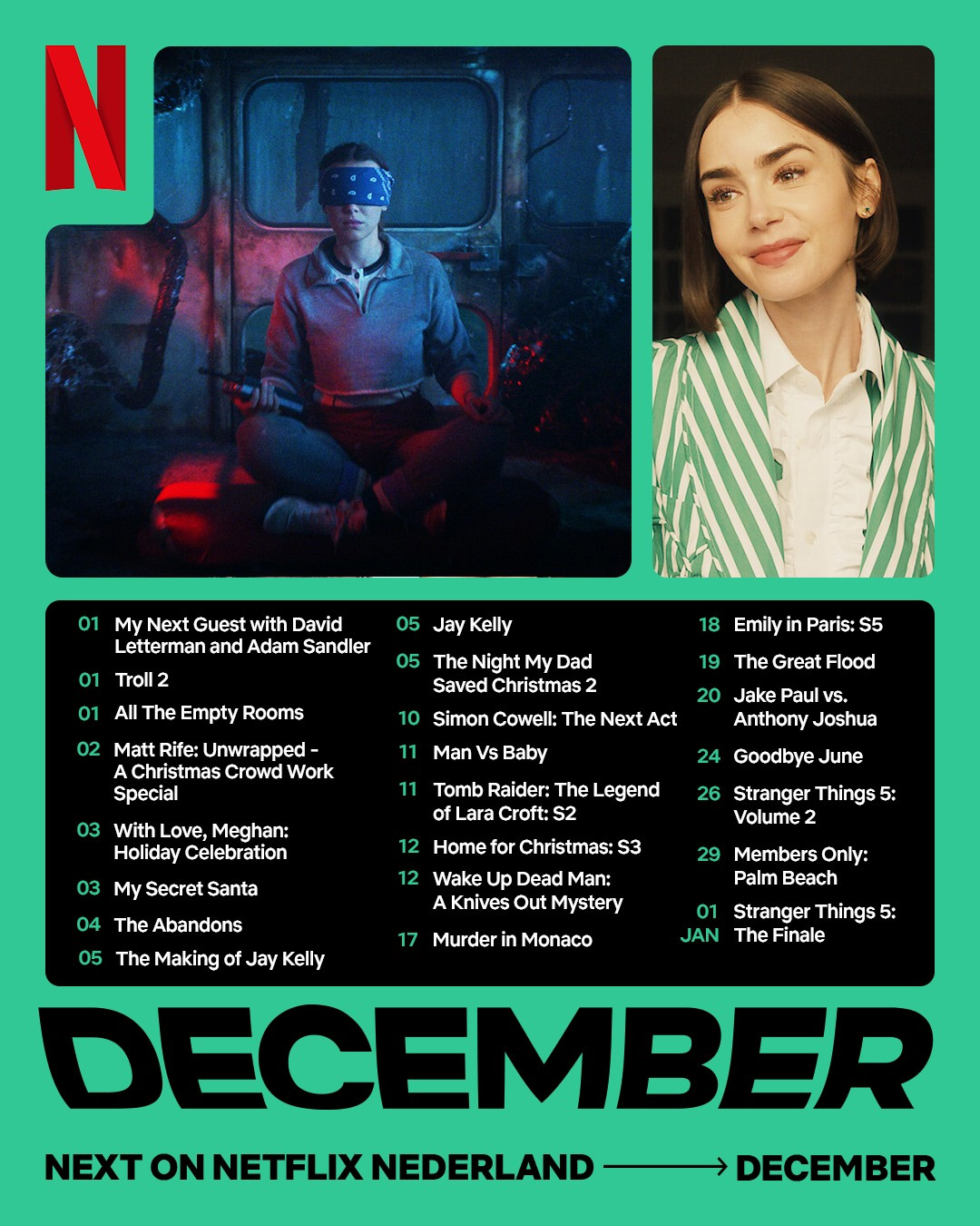 Het vijfde seizoen van ‘Emily in Paris’ is vanaf 18 december op Netflix te vinden. Verschillende kersttitels zoals ‘My Secret Santa’ en ‘Home for Christmas: S3’ komen ook online. Op tweede kerstdag is het de beurt aan Stranger Things 5: Volume 2 en op nieuwjaarsdag “The Finale”. Liefhebbers van Rowan Atkinson kunnen de acteur vanaf 11 december aanschouwen in de film “Man Vs Baby”. De fantastische Noorse kerstserie Hjem til Jul (Home for Christmas) komt op 12 december met een derde seizoen.