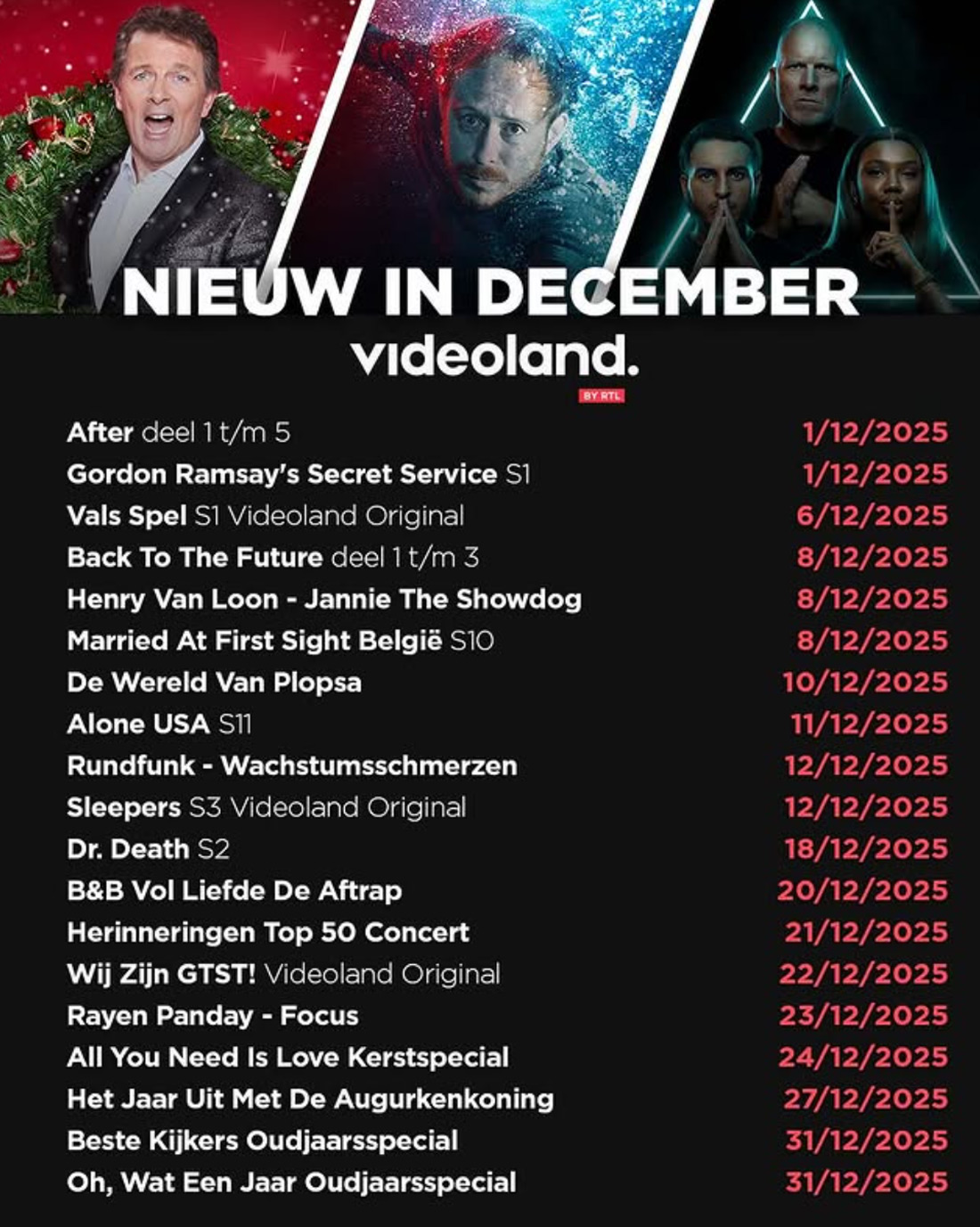 Abonnees van Videoland kunnen zich eind deze maand vergapen aan een nieuwe kerstspecial van “All You Need is Love”. Maar natuurlijk is er nog veel meer nieuws. Zo is vanaf nu de serie ‘After’ van deel 1 tot en met deel 5 daar te vinden, en geldt dat vanaf 10 december ook voor de serie ‘Alone USA’, waarvan het elfde deel online komt. Married at First Sight België, de aftrap van B&B Vol Liefde en Back to the Future vullen de lijst verder aan. De Videoland Original ‘Wij Zijn GTST!’, staat vanaf 22 december op Videoland.