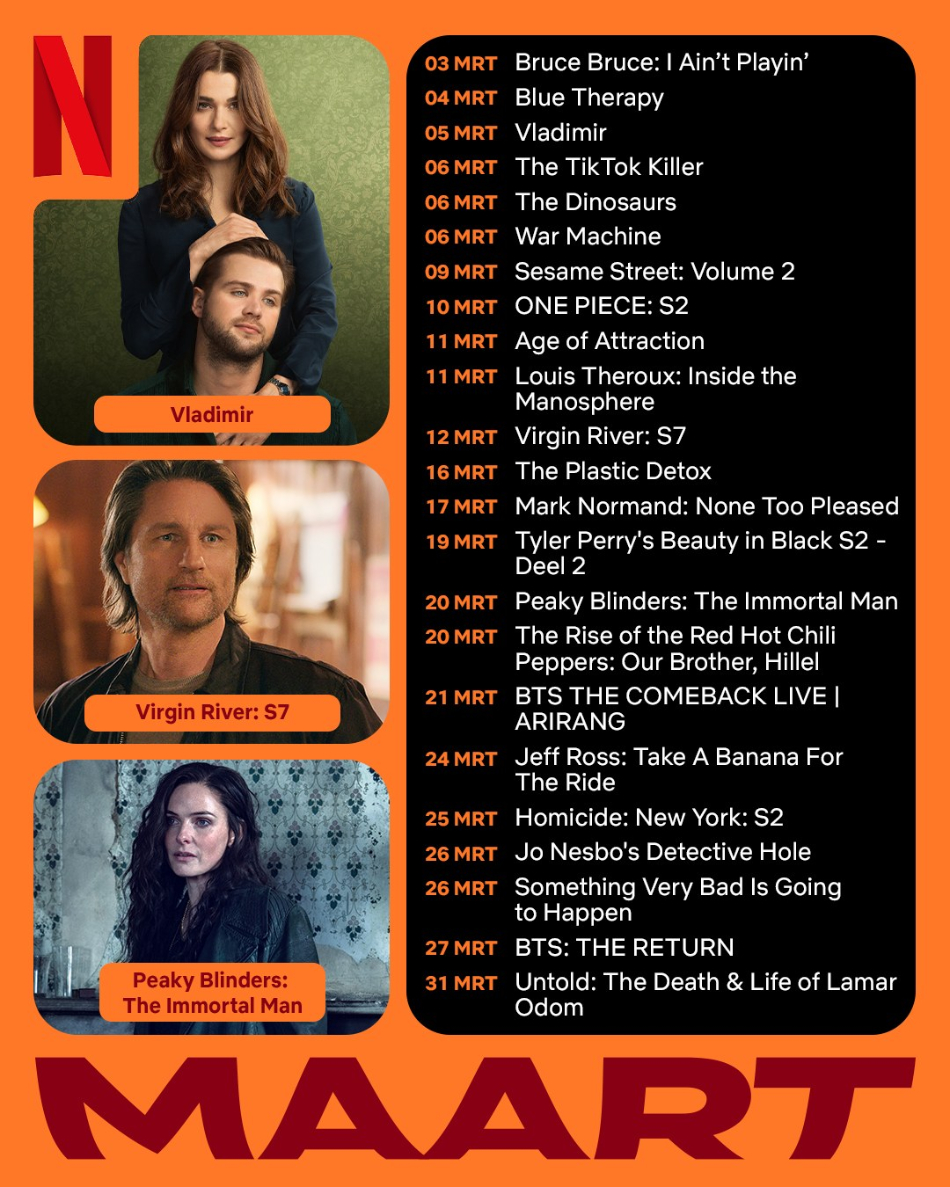 Later in de maand stream je op 19 maart onder meer Steel Ball Run JoJo’s Bizarre Adventure en Tyler Perry’s Beauty in Black (seizoen 2B), gevolgd door de film Peaky Blinders: The Immortal Man op 20 maart. Op 23 en 24 maart verschijnen Inside (seizoen 3) en Ready or Not: Texas, en op 25 maart kijk je naar MLB Opening Night en Heartbreak High (seizoen 3). De maand sluit je af met nieuwe titels als Jo Nesbø’s Detective Hole en Something Very Bad Is Going to Happen (beide 26 maart), The Parisian Agency: Exclusive Properties (seizoen 6, 27 maart) en diverse documentaires, cabaretvoorstellingen en kids- en familietitels.