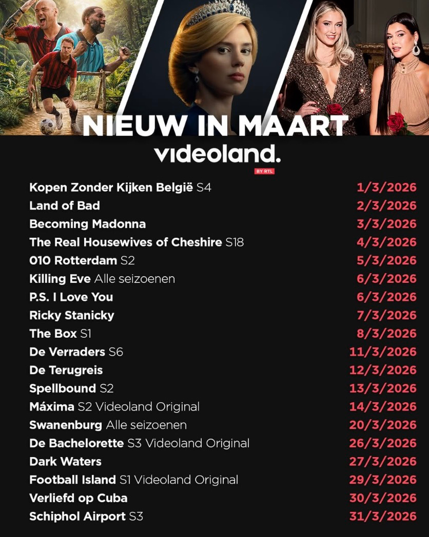 Het nieuwe seizoen van Kopen zonder Kijken België, ook wel bekend als Blind Gekocht, staat online op de Nederlandse streamingdienst. Videoland werkt verder aan het zesde seizoen van De Verraders, De Bachelorette, Máxima (seizoen 2) en aan het eind van de maand aan Schiphol Airport seizoen 3.