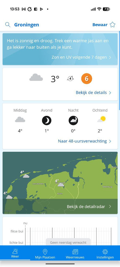Een betrouwbare weer-app vind ik wel fijn. Ieder jaar lees ik daarom graag de weer-app test. Net zoals vorig jaar was de Weeronline app hierin de winnaar. Het is erg fijn dat je meteen de actuele temperatuur ziet en wat het qua dagdelen doet. En bovenin zie je ook eventuele waarschuwingen of tips, bijvoorbeeld of het komende uur er regen gaat vallen of dat er dichte mist is. Verder zit er ook een 14-daagse voorspelling in die ik veel gebruik.